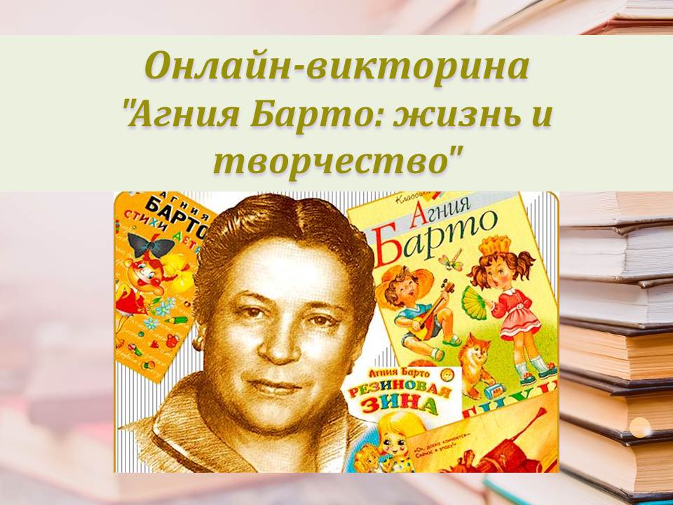 17 февраля родилась Агния Львовна Барто — русская советская детская поэтесса, писательница, киносценарист, радиоведущая; лауреат Сталинской премии второй степени (1950) и Ленинской премии (1972). К этой дате Судакская городская библиотека им. В.П. Рыкова подготовила онлайн-викторину "Агния Барто: жизнь и творчество".. |