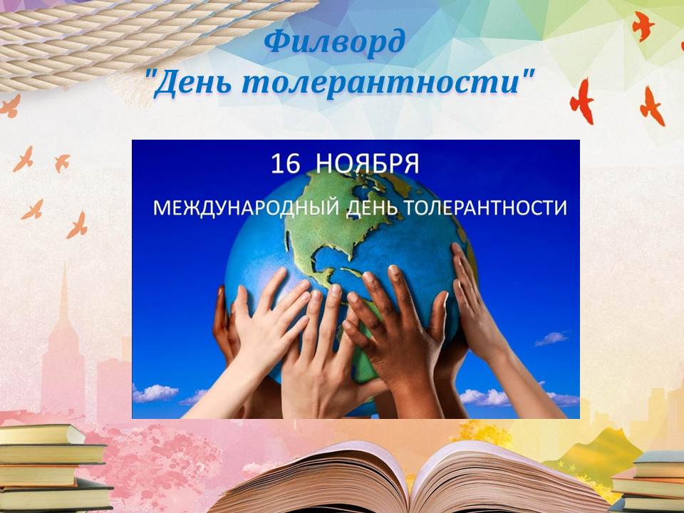 16 ноября ежегодно отмечается Международный день толерантности (терпимости). Этот Международный день был торжественно провозглашён в «Декларации принципов терпимости» ЮНЕСКО. Декларация была утверждена в 1995 году на 28-й Генеральной конференции ЮНЕСКО (резолюция № 5.61). К этой дате Судакская городская библиотека им. В. П. Рыкова подготовила филворд "День толерантности"...