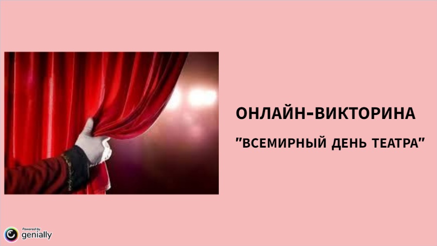 Всемирный день театра — международный профессиональный праздник всех работников театра, отмечаемый по всей планете ежегодно 27 марта. Этот праздник традиционно проходит под девизом: «Театр как средство взаимопонимания и укрепления мира между народами». К этой дате Судакская городская библиотека им. В.П. Рыкова подготовила онлайн-викторину "Всемирный День театра"...